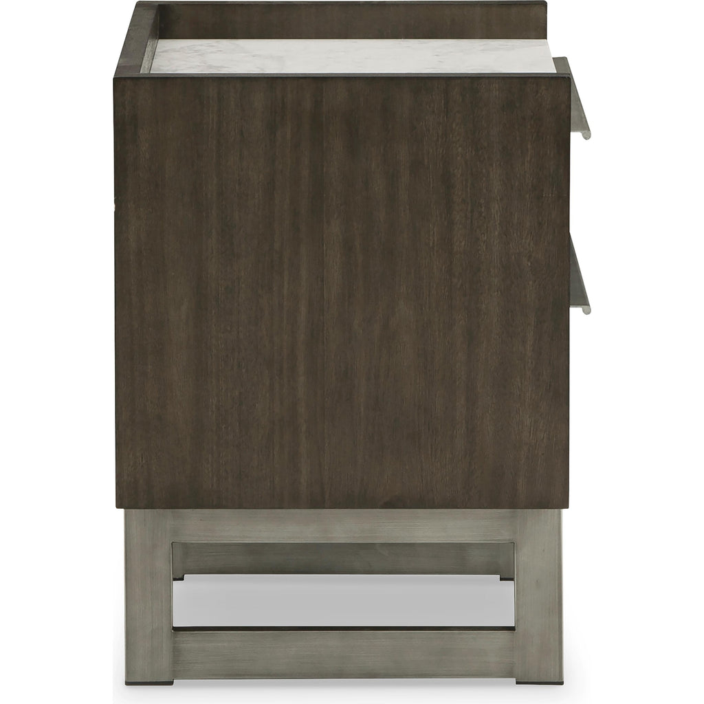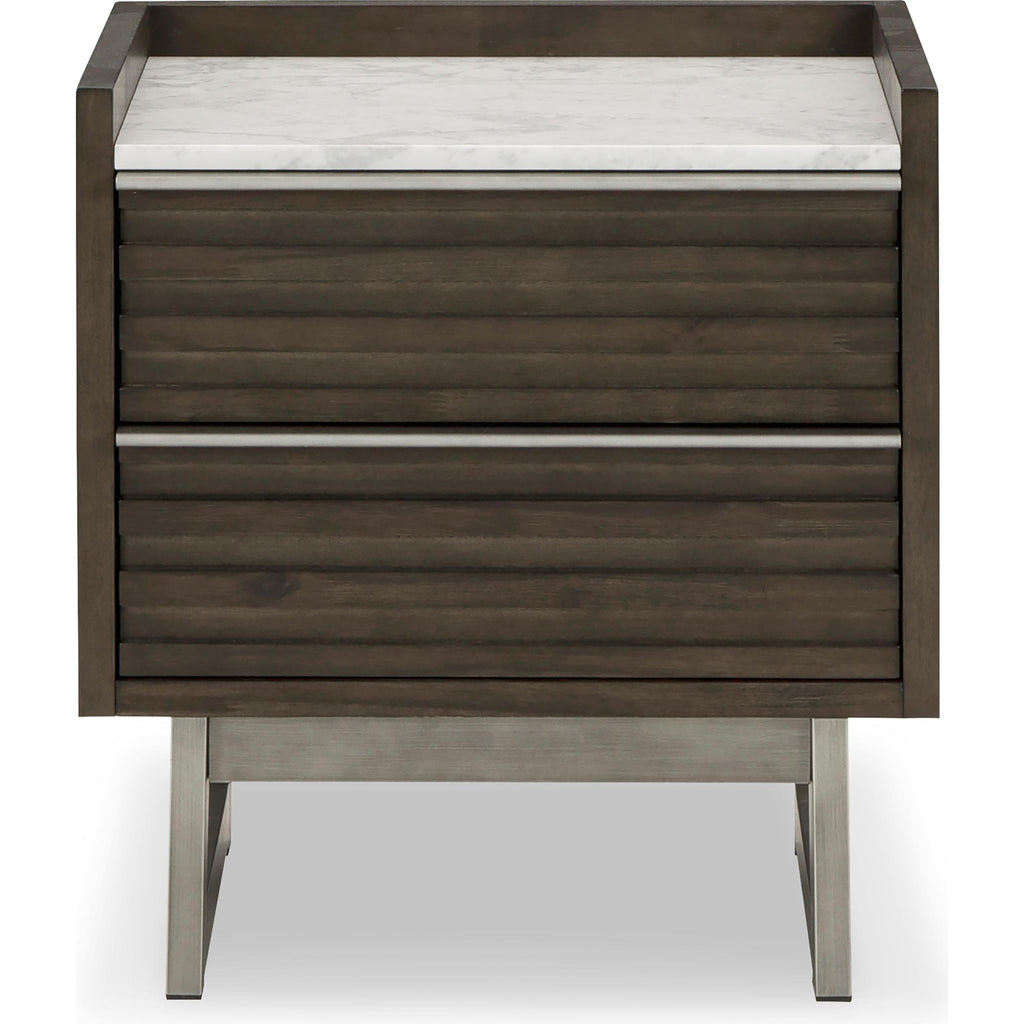 Des lignes épurées confèrent élégance et structure à cette table de chevet. Sa finition brun grisâtre complexe et riche contraste parfaitement avec un plateau en marbre blanc, tandis que la silhouette épurée présente des lattes superposées. Une base et une barre en métal dans une finition en acier peu brillant ajoutent à l’ambiance contemporaine de cette pièce.