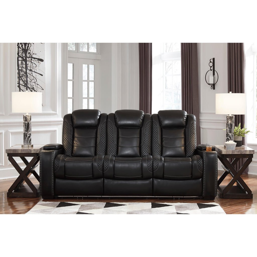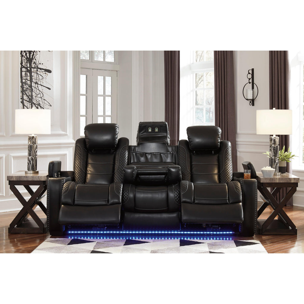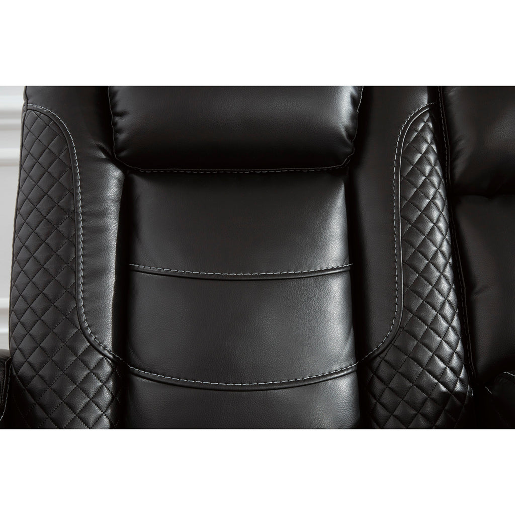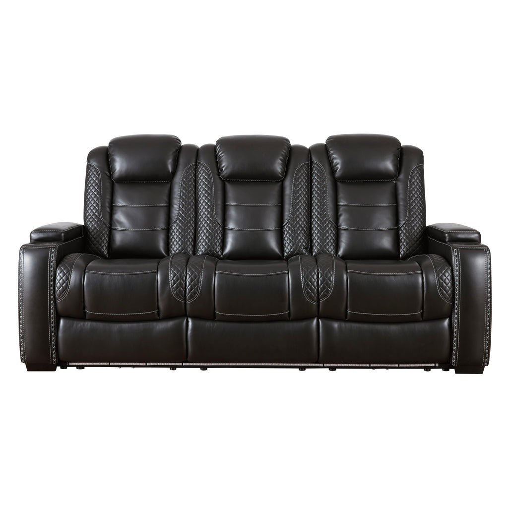 Ce canapé inclinable électrique s'inspire des automobiles de luxe avec ses coutures en treillis et en croix, pour une esthétique richement personnalisée qui vous donne de nombreuses raisons de faire la fête. Des coussins somptueusement rembourrés et un revêtement en similicuir noir nuit spectaculaire ajoutent à l'indulgence. Lorsqu'il est temps de passer à l'action, les deux sièges baquets inclinables du canapé (le siège du milieu est fixe), les appuie-têtes réglables électriquement Easy View™ et le siège central qui se replie en table vous permettent de rester dans le siège du conducteur.