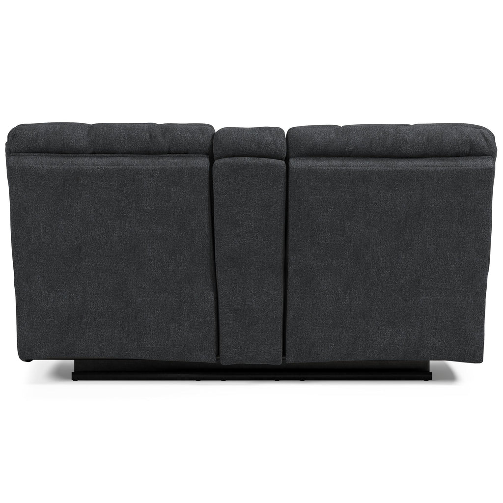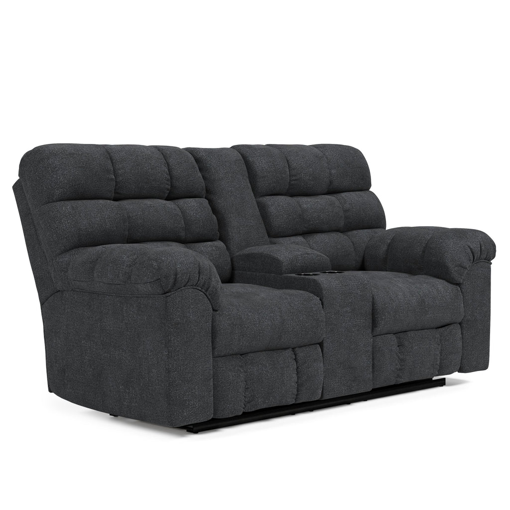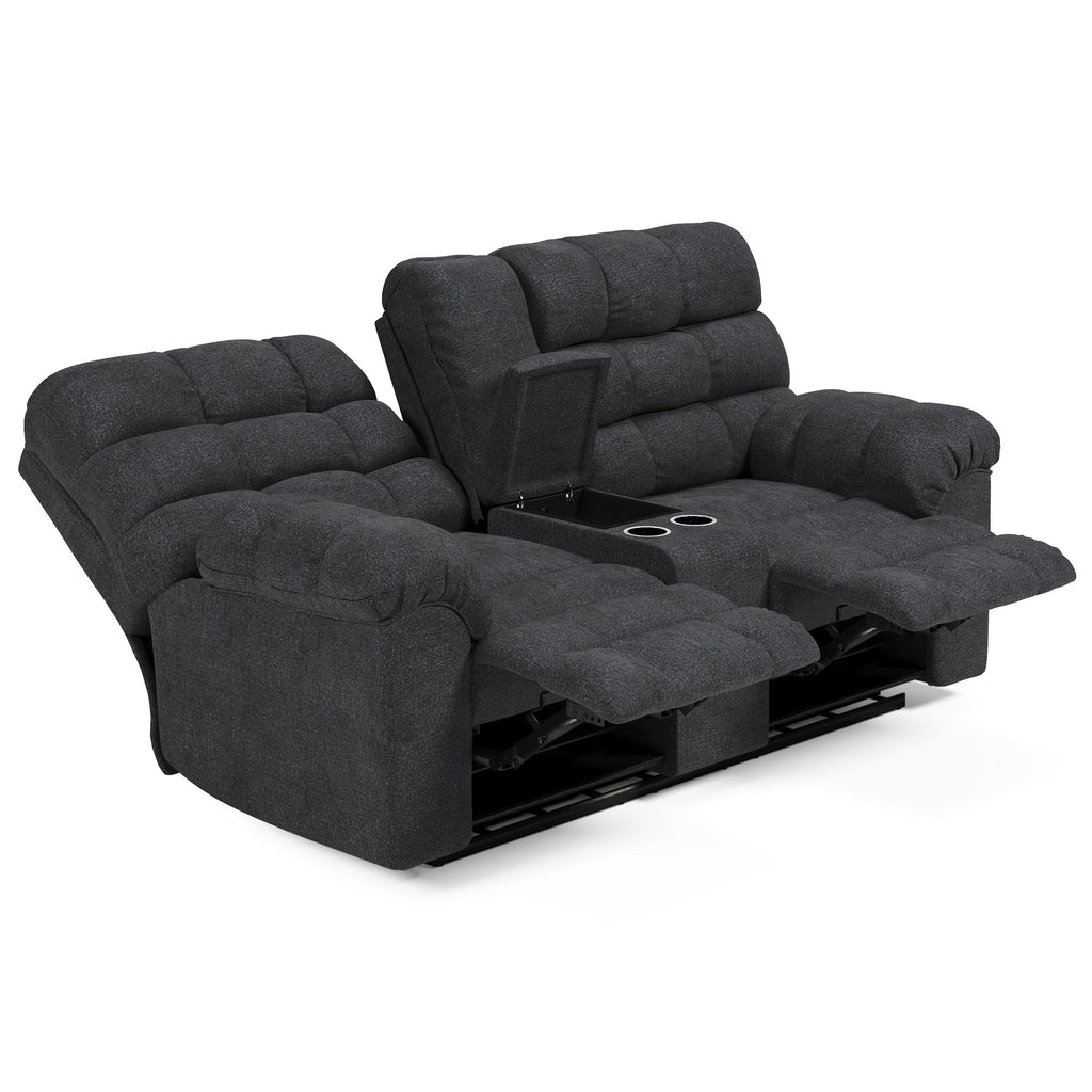 Adoptez le confort et le style ultimes. Ce canapé inclinable est recouvert d’un tissu bleu-gris réconfortant, embelli par des coutures plissées et un capitonnage à dos biscuit. Sa table déroulante avec porte-gobelets ajoute des fonctionnalités. Les accoudoirs séduisants et généreusement rembourrés du canapé rendent la scène encore plus onirique.