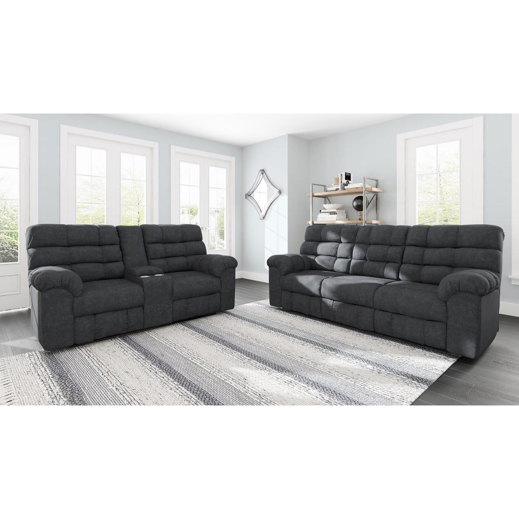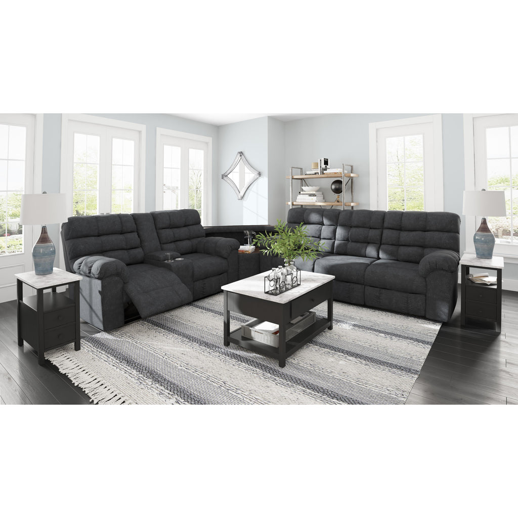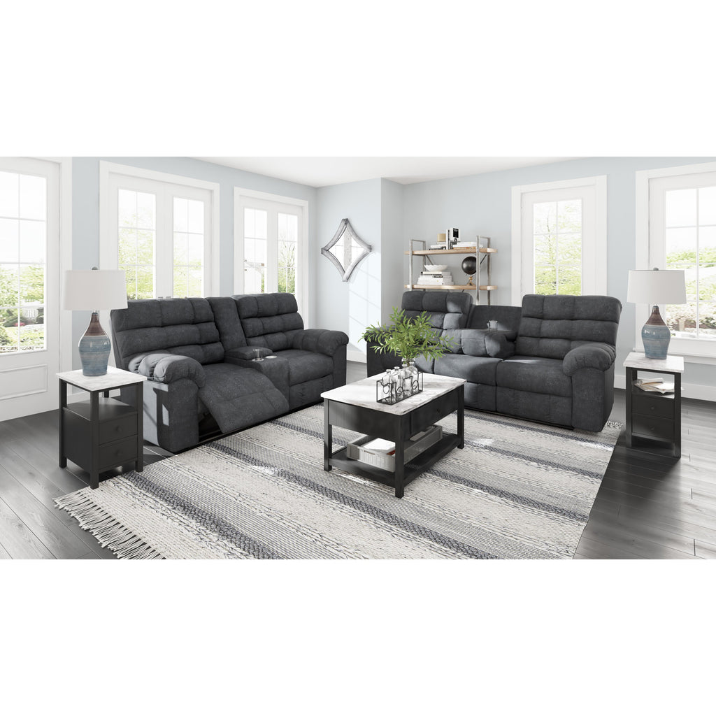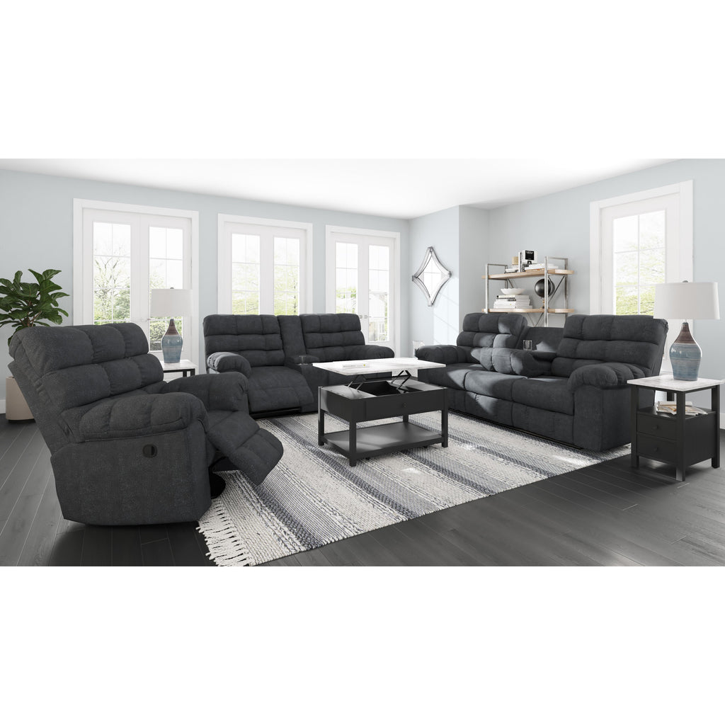Adoptez le confort et le style ultimes. Ce canapé inclinable est recouvert d’un tissu bleu-gris réconfortant, embelli par des coutures plissées et un capitonnage à dos biscuit. Sa table déroulante avec porte-gobelets ajoute des fonctionnalités. Les accoudoirs séduisants et généreusement rembourrés du canapé rendent la scène encore plus onirique.