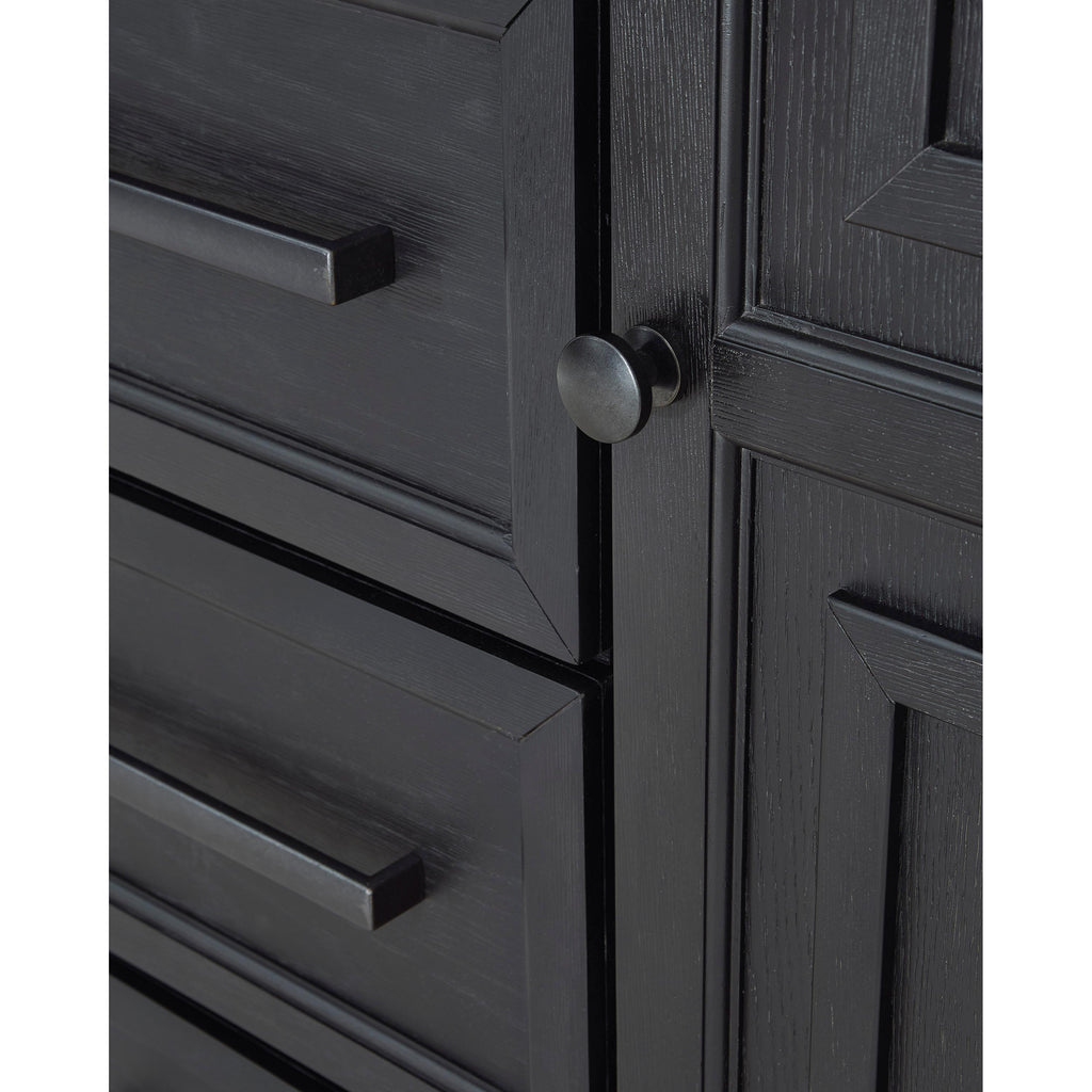 Cette commode à portes est un style contemporain décontracté, tout simplement réussi. Sa palette de couleurs bicolores présente une riche couleur principale noire brossée accentuée par un magnifique ton de bois brun grisâtre poussiéreux. Et il y a beaucoup de rangement pour répondre facilement à vos besoins de garde-robe. La commode dispose de 5 tiroirs à fermeture douce et derrière la porte, vous trouverez des plateaux coulissants pour les chaussures ou autres accessoires, ainsi que des étagères pour les objets volumineux.