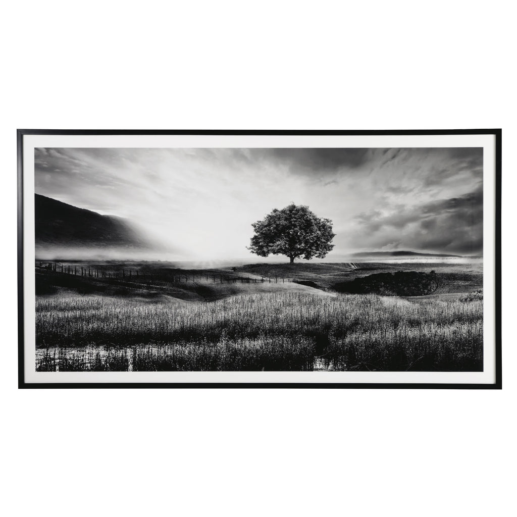 Rempli d'éléments naturels apaisants, cet art mural a un aspect raffiné avec une sensation de repos. Il capture un paysage avec des collines vallonnées, attirant votre regard vers l'arbre qui se dresse au centre de la création. Les tons plus clairs des nuages apportent de la luminosité au design noir et blanc, ce qui en fait un ajout frappant à votre décor moderne.