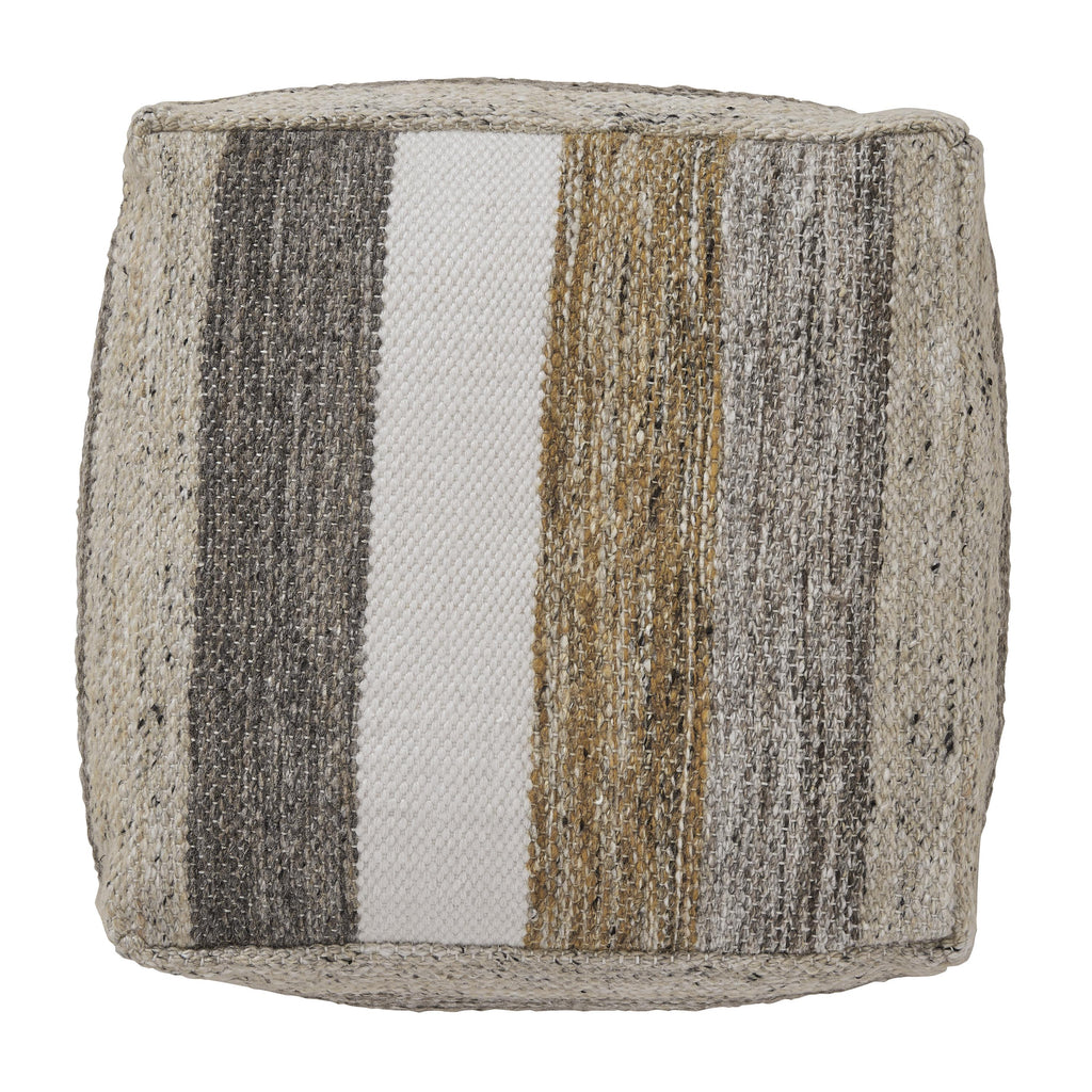 Tissant des rayures dans des tons terreux et terreux, ce pouf est d'une beauté naturelle. Il allie simplicité et fonctionnalité, avec des teintes de blanc, de miel et des nuances de gris et de marron pour un style décontracté. Qu'il soit utilisé comme repose-pieds ou comme table d'appoint, cette pièce a un attrait indéniablement universel.