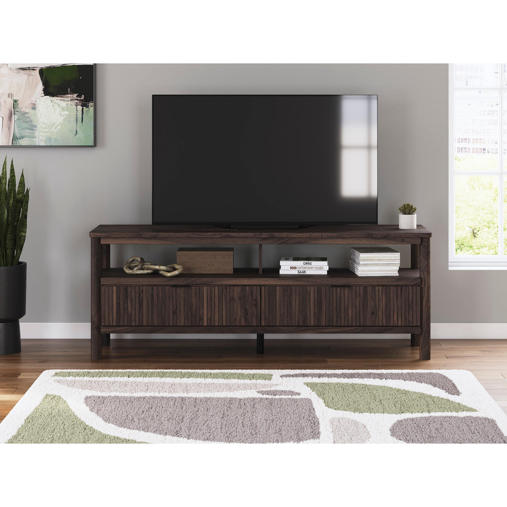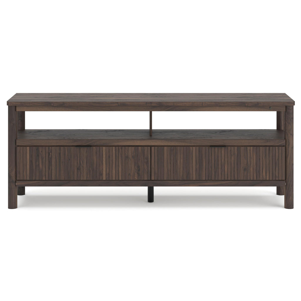 Conçu dans un souci de forme et de fonction, ce meuble télé apporte une touche de caractère rétro-cool à votre esthétique bohème moderne. Un design à anches sur ses tiroirs ajoute une touche tendance au rangement des essentiels de divertissement. Chaleureusement accueillant avec une riche finition brune, le meuble TV se marie bien avec les teintes sourdes, les tons de terre et d’autres neutres. Et pour plus d’ambiance, l’éclairage sous le dessus apporte une ambiance cool à vos émissions ou jeux vidéo préférés. Quelle version raffinée du style décontracté.