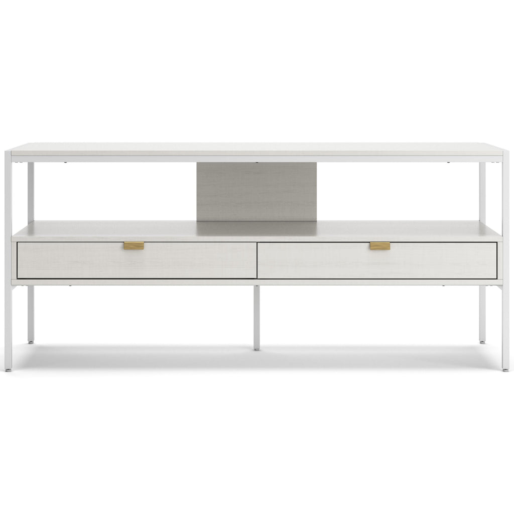 Donnez vie à votre vision d'un salon moderne avec ce meuble TV au design élégant. Sa construction linéaire et sa finition blanche gardent les choses minimalistes. Une étagère ouverte et deux tiroirs vous permettent de ranger dans un style simple et épuré, complétant cette pièce polyvalente et frappante.