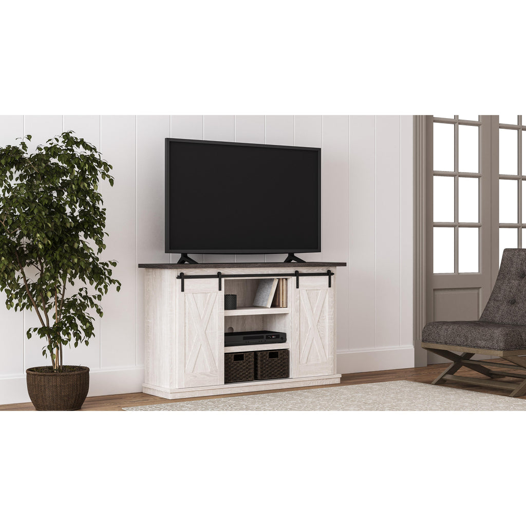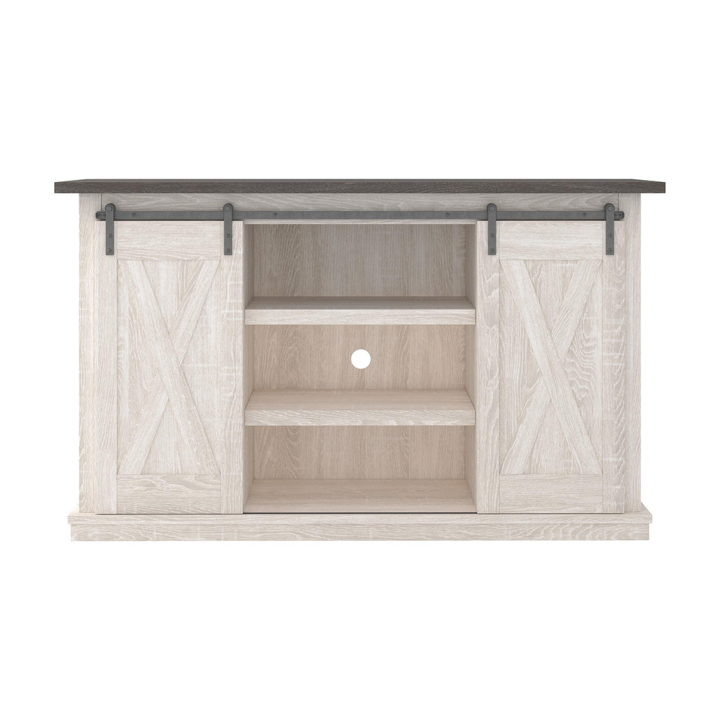 Avec sa finition bicolore, ses détails en croix et son charme authentique, ce meuble TV s'accorde parfaitement avec votre approche décontractée du style haut de gamme. Magnifiquement conçu pour accueillir votre équipement multimédia, il est bien équipé avec des étagères réglables, des découpes pour la gestion des câbles et, bien sûr, une paire de portes de grange coulissantes que vous pouvez centrer ou placer sur le côté. Quelle maîtrise de la vie de ferme moderne.