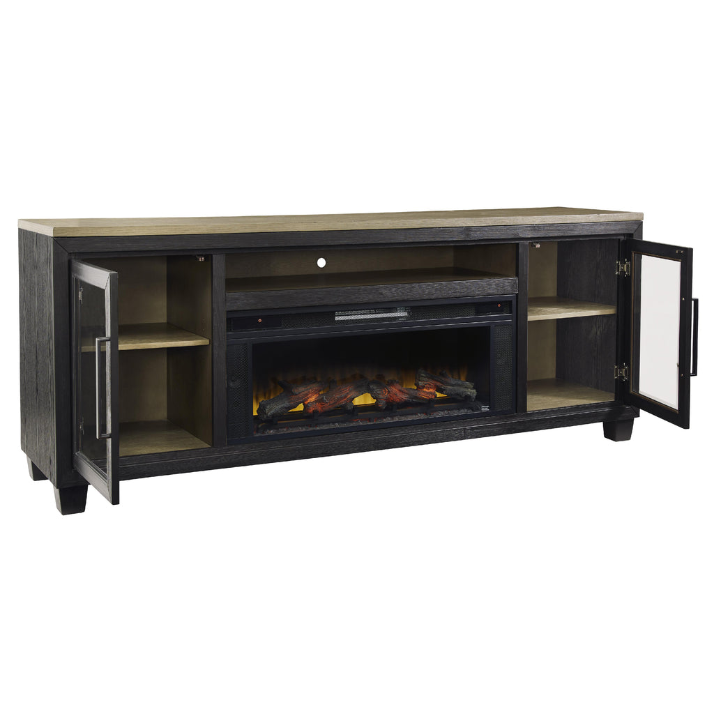 Ce meuble TV avec cheminée est de style contemporain, rustique et décontracté, tout simplement réussi. Sa palette de couleurs bicolores présente une riche finition noire brossée accentuée d'un ton de bois brun grisâtre poussiéreux. Avec deux armoires vitrées (chacune avec une étagère réglable), un casier ouvert et une étagère centrale amovible, il offre de nombreux rangements pour ranger tous vos besoins électroniques. Pour un plaisir visuel accru, l'insert de cheminée électrique infrarouge apporte la sensation chaleureuse d'une cheminée sans le travail ni les soucis. C'est exactement ce qu'il vous faut pour une soirée parfaite.