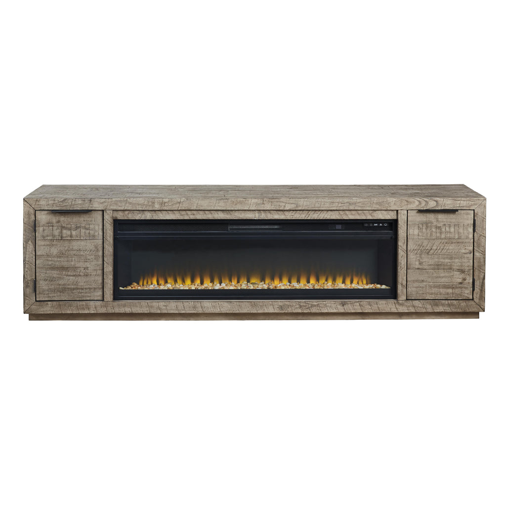 Ce meuble TV extra-large avec insert de cheminée saura vous séduire par son interprétation audacieuse de l'expression rustique moderne. Son profil minimaliste chic et net est enrichi d'un grain de bois de pin saisissant et d'une finition grise patinée avec une texture de marque de scie vieillie. Pour votre plus grand plaisir visuel, le large insert de cheminée vous offre la sensation chaleureuse d'une cheminée sans les tracas supplémentaires. D'une simple pression sur un bouton, réglez la température et les flammes changeantes de couleur, et réglez la minuterie pour un plaisir durable. Il est livré avec de faux cristaux de verre et des pierres naturelles, ce qui vous permet de personnaliser l'apparence du lit de flamme.
