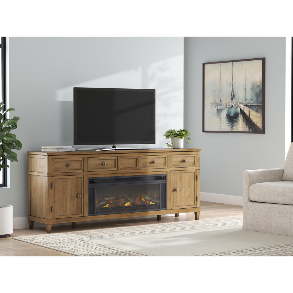 Adoptant une approche intemporelle de la beauté décontractée, ce meuble TV avec foyer électrique apporte une élégance décontractée au quotidien. Avec son ton de bois brun pâle, il se glisse parfaitement dans l’esthétique de votre pièce. Deux armoires spacieuses (chacune avec une tablette réglable) et quatre tiroirs offrent beaucoup de rangement pour les médias et les appareils électroniques. Rehaussant l’expérience, l’insert de foyer apporte une touche de chaleur et une belle ambiance à votre salon. D’une simple pression sur un bouton, réglez la température et la luminosité de la flamme, et connectez votre appareil aux haut-parleurs sans fil intégrés. L’effet de flamme comprend un ensemble de bûches d’apparence réaliste avec des braises rougeoyantes, ainsi qu’une lumière ambiante.