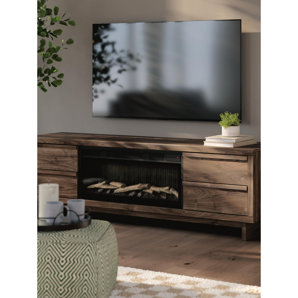 Style nostalgique, réoutillé pour les tendances d’aujourd’hui. Ce meuble TV avec foyer électrique apporte une touche élevée à l’esthétique mod. Ses tons bruns chauds reflètent les vibrations du milieu du siècle que vous aimez, tandis que la base angulaire incorpore des motifs contemporains. Les poignées de tiroir intégrées complètent le look dans un style élégant. Pour plus d’ambiance, le foyer électrique apporte une ambiance chaleureuse à votre salon. D’une simple pression sur un bouton, activez la flamme allumée par LED et réglez la température ou la luminosité de la flamme. L’effet flamme comprend plusieurs options de couleurs et un ensemble de bûches de faux bouleau d’aspect réaliste.
