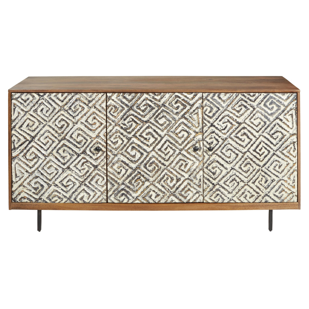 Si vous êtes à la recherche d'un meuble d'appoint décontracté, aux lignes épurées et plein de caractère, vous voudrez certainement réserver un espace à ce meuble d'appoint. Les fabuleuses portes encastrées séduisent par leur design sculpté en forme de clé grecque, qui ajoute une dimension et un contraste de tons. Trois tablettes intérieures répondent à vos besoins de rangement.