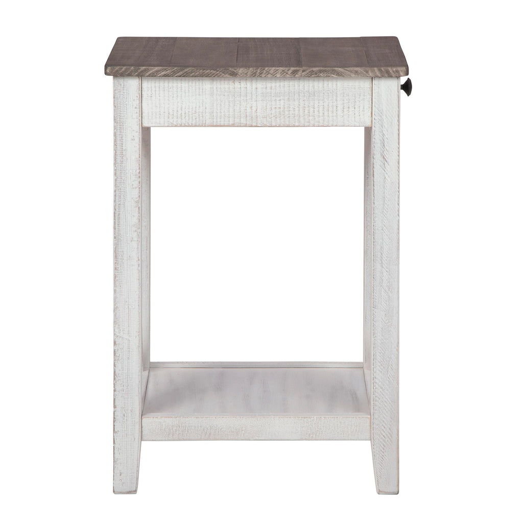 Le moderne rencontre le vintage dans cette table d’appoint. Fabriqué en bois, il crée une ambiance vintage avec une finition blanche et grise vieillie et des supports croisés sur les deux côtés. Deux ports de chargement USB ajoutent une fonction moderne. C’est une pièce incontournable pour votre espace de vie.