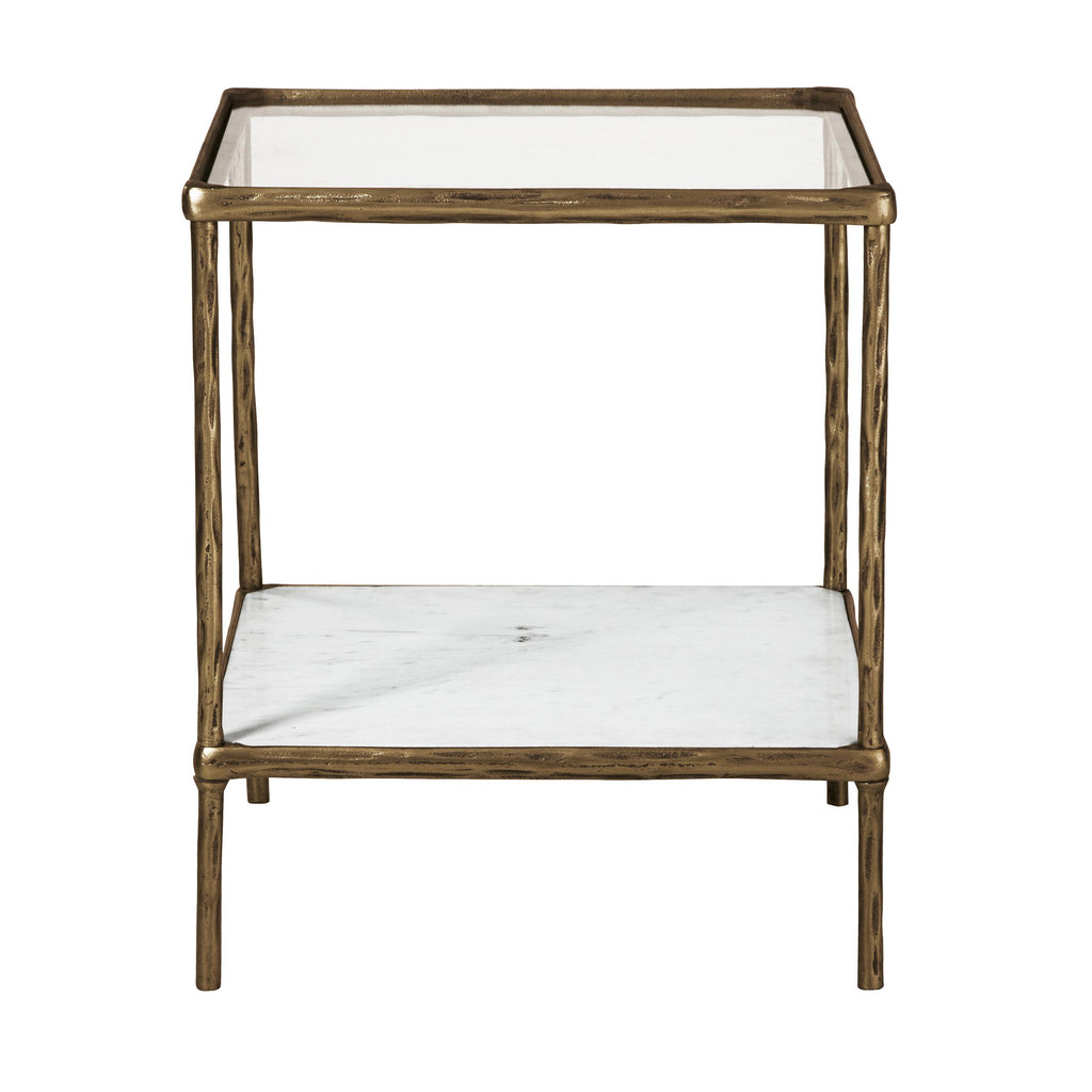 D'un design classique avec une touche de texture, cette table d'appoint est à la fois élégante et fonctionnelle. Le plateau en verre offre un perchoir parfait pour une lampe, tandis que la tablette inférieure en marbre blanc est idéale pour poser des livres et d'autres objets décoratifs. La finition de ton laiton vieilli de la structure donne un aspect rustique et luxueux qui reste polyvalent, s'adaptant aux espaces décontractés ou contemporains.