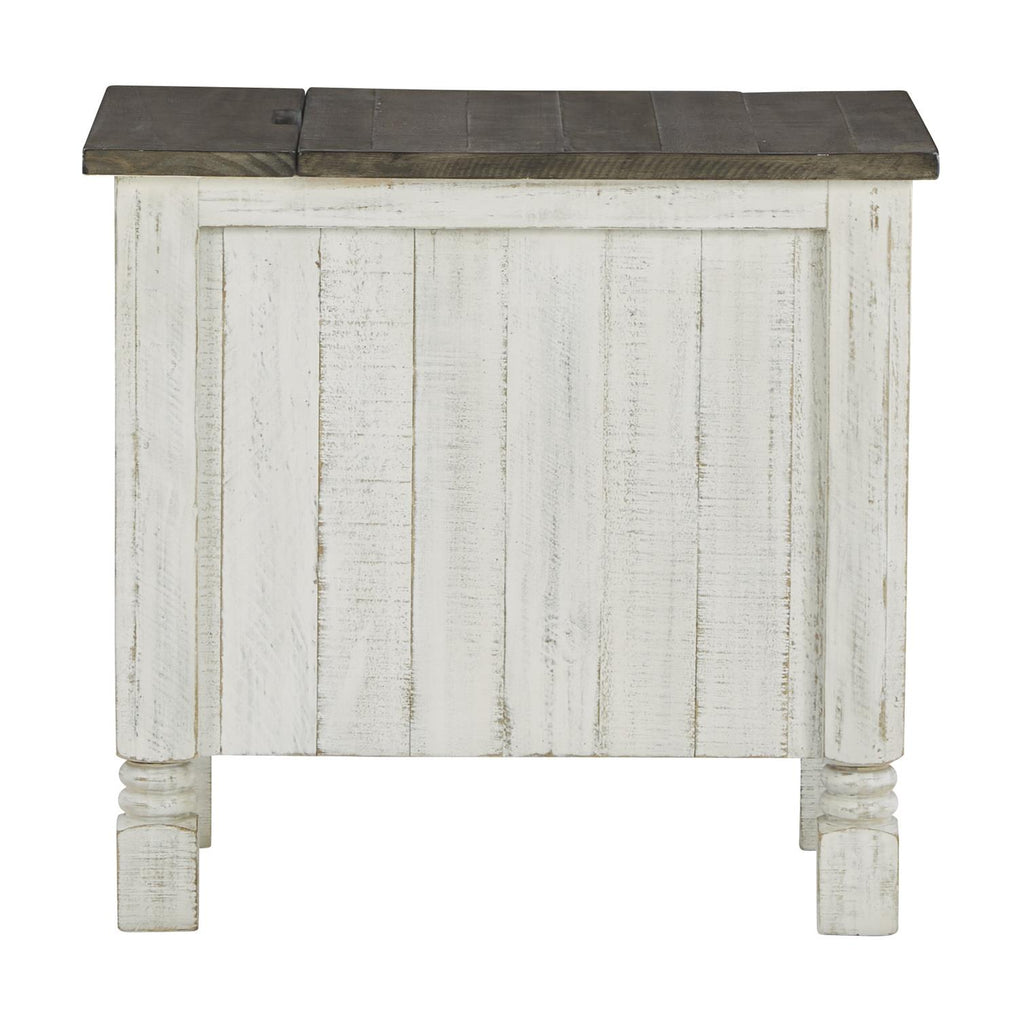 Quelle interprétation originale du style classique de la campagne! Inspirée par le savoir-faire des fermes américaines, mais avec une sensibilité plus élevée, cette table de bout de canapé combine des détails distinctifs tels que des accents de poteaux tournés et des façades de portes surélevées pour un look substantiel qui se sent comme à la maison. Ceux qui apprécient le caractère rustique devraient remarquer l'épaisse moulure en couronne de la table, embellie par une finition bicolore rétro. Un petit couvercle rabattable situé sur le dessus dissimule une prise de courant et des ports USB pour garder les appareils électroniques chargés et à portée de main.