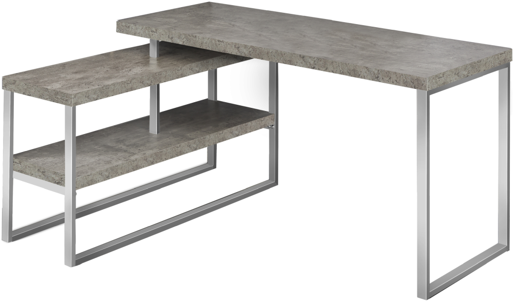 Finished in a grey concrete-look laminate, with a silver metal frame, this L-shaped computer desk saves space when used in a corner but is finished on all sides for a polished look wherever it is placed in a home office.