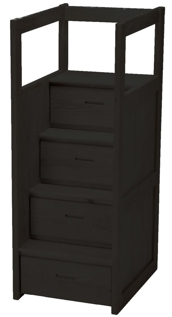 The staircase works well with all CD bunk beds - as well as your existing bunk bed. The staircase can be placed on either end of the bunk bed. Each drawer is the full depth of the cabinet. The bottom drawer rolls out on casters for full access!