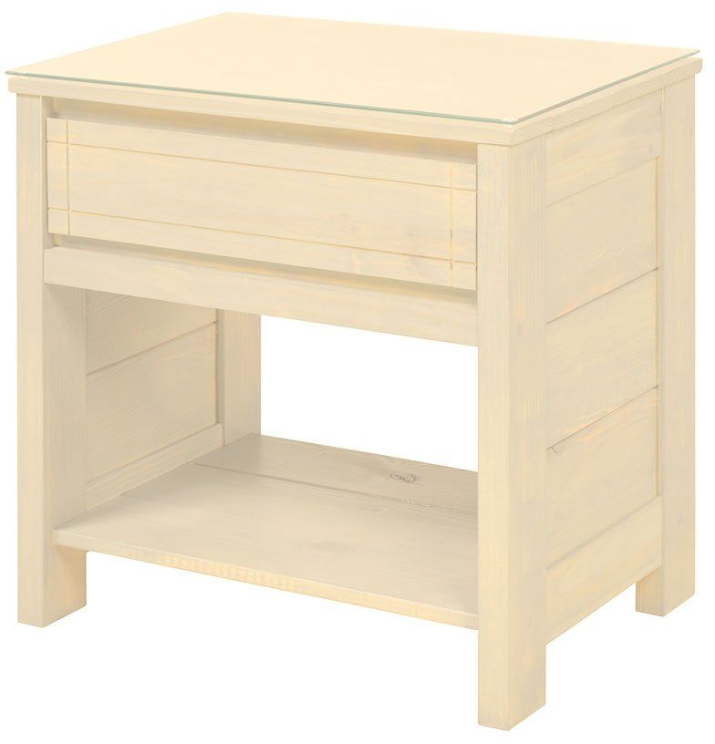 Dessus : Pin jaune du sud massif avec un dessus en verre trempé ; Arrière : Pin jaune du sud massif ; Fond de tiroir : Contreplaqué