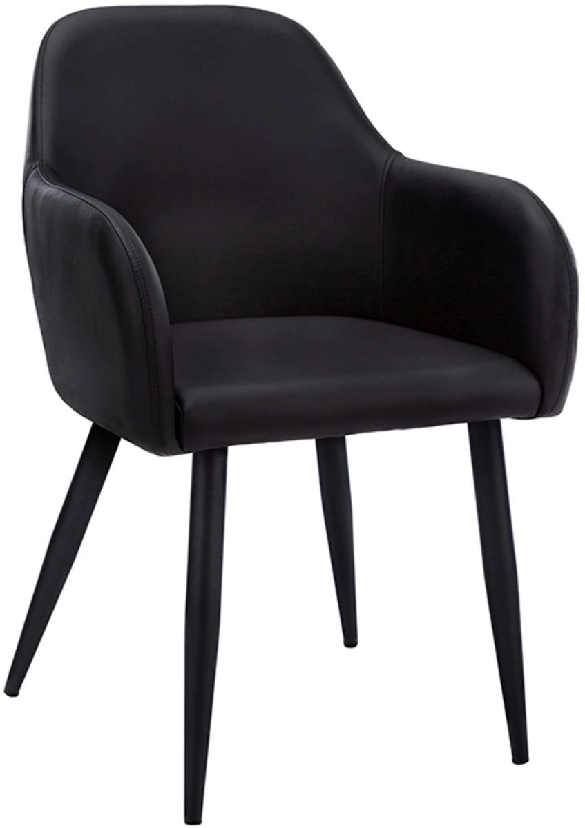 Rembourré en similicuir noir avec des coutures minimales pour un look épuré, le dos et les côtés rembourrés se courbent autour du siège rembourré pour une sensation de douceur. Les pieds en métal noir inclinés et effilés ajoutent un attrait élégant. Vendues en ensemble de 2 pièces, ces chaises ont un style moderne et rétro idéal pour une cuisine avec coin repas ou une salle à manger formelle, ou comme chaises d'appoint dans d'autres pièces.