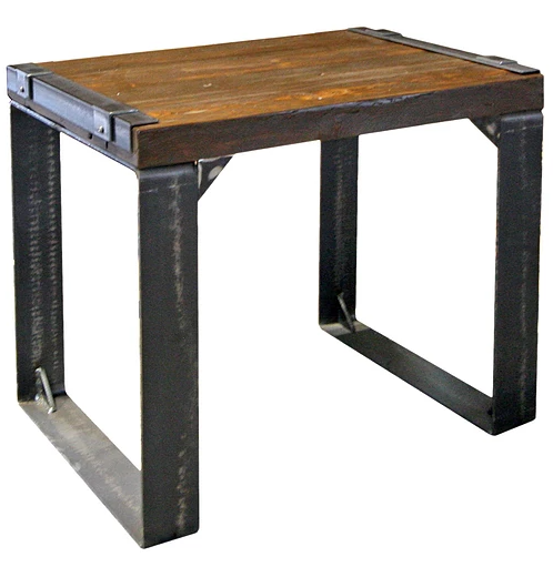Sides of barn wood top are decorated with steel angles
