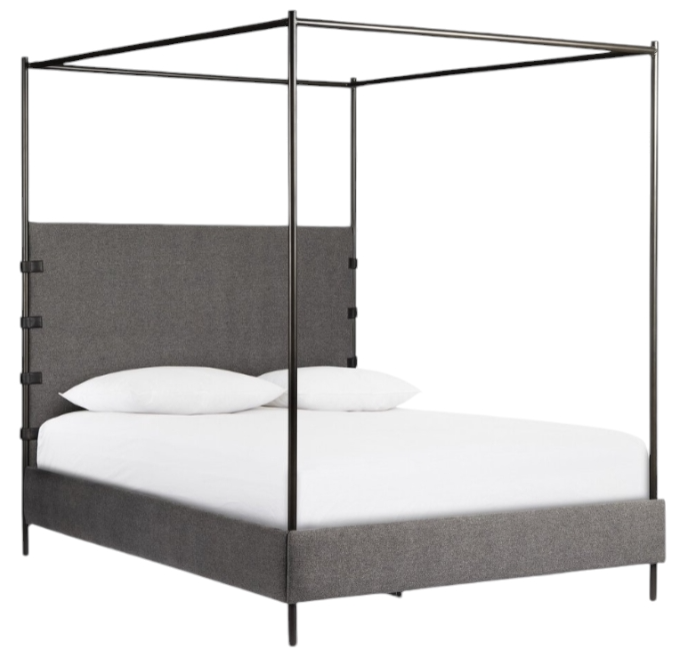Bring texture into play. This iron canopy bed features a headboard upholstered in a versatile grey fabric with decorative faux leather straps. Standard box spring required. This bed is not compatible with an adjustable mattress.En savoir plus
