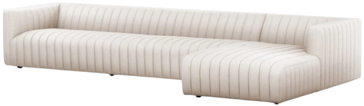 The Augustine 2-Piece Chaise Sectional features a dramatically channeled upholstery, offering a crisp, clean look inspired by modern menswear. This two-piece sectional, with a right-arm facing chaise, is generously sized for larger spaces, providing ample comfort and a sophisticated, stylish presence perfect for any living room.En savoir plus