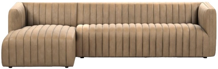 A dramatically channeled sofa wrapped in top grain leather creates a mature, clean look inspired by modern menswear. Two-piece sectional with left arm-facing chaise, perfectly sized for smaller spaces. Its silhouette and high-quality craftsmanship make it an ideal choice for stylish, comfortable seating.En savoir plus