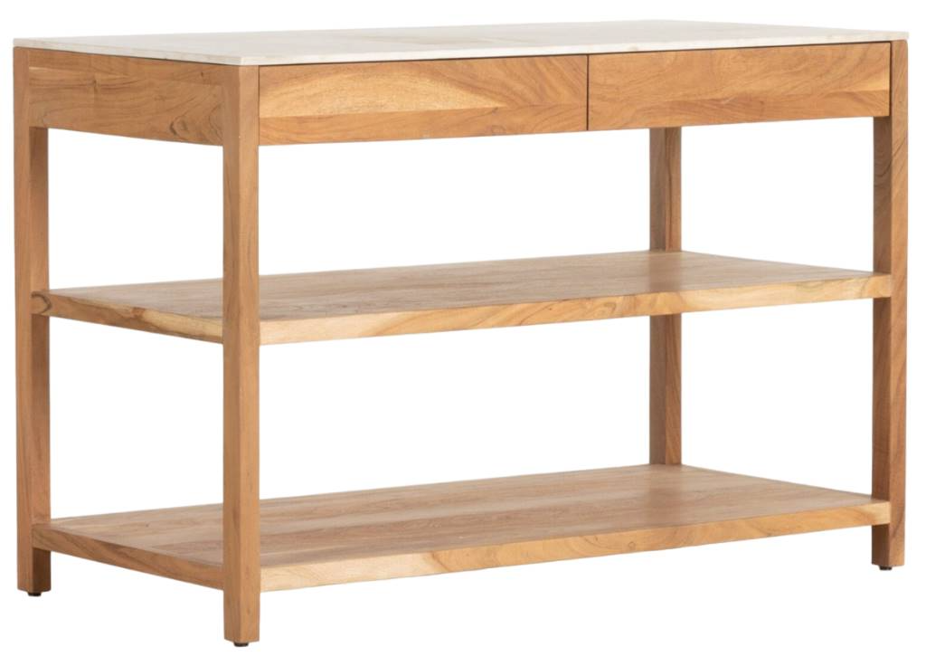 Create style and surface space with a kitchen island made from smoked acacia and solid white marble. Roomy open shelving offers ample options for storage and display, while four drawers keep frequently used items within reach.En savoir plus