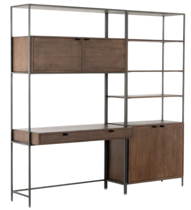 A mid-century-inspired design, poplar and raw iron fuse for a forward-thinking bookcase with modular capabilities, featuring generous storage space by way of open shelving, concealed cabinetry and dual drawers. Metal-secured pulls of top-grain leather add a fresh element of surprise.En savoir plus