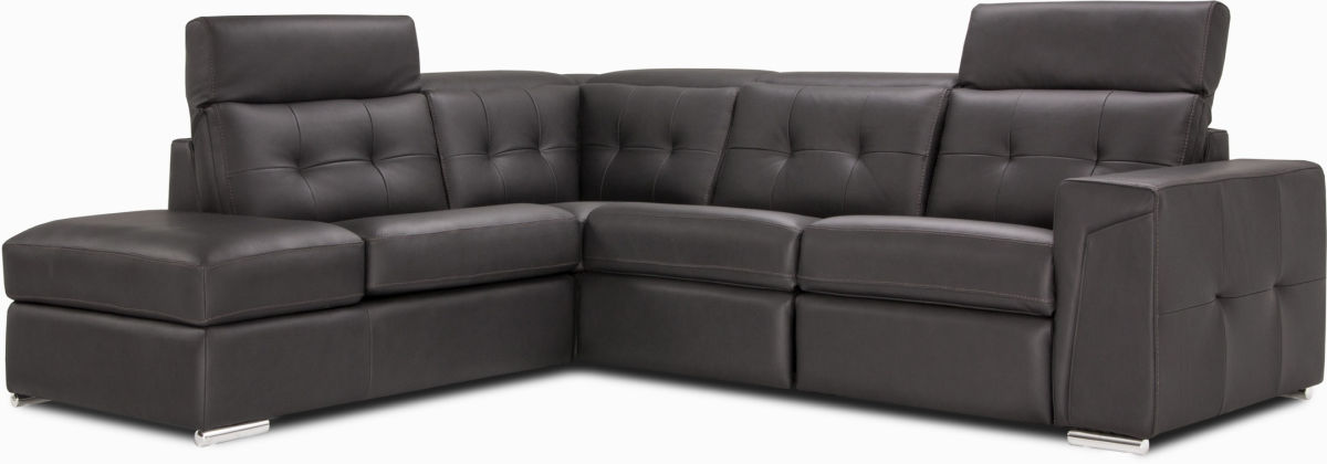This sectional features manual adjustable headrests, a full leg power recliner, wall hugger mechanism, shaped foam and memory foam, attached back cushions, a bumper with storage, stitched detailing, and is made of leather.En savoir plus