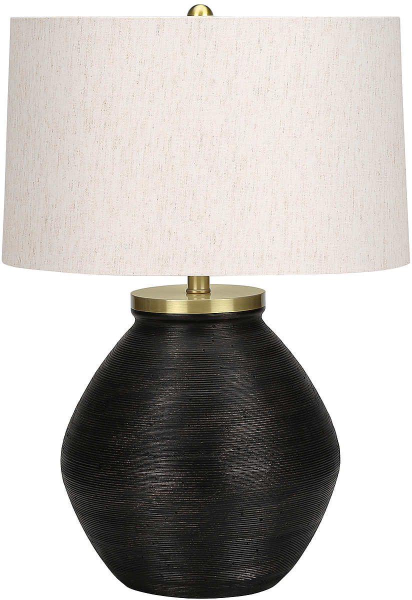 Apportez un peu de chaleur et de luminosité à votre maison avec cette élégante lampe de table contemporaine de 25 po (63,5 cm) de hauteur dans une élégante base en forme de pot avec une texture de béton noir de fines crêtes doublées, surmontée d'un abat-jour tambour en lin ivoire et d'un fleuron rond doré