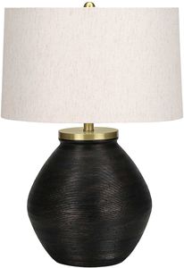 Elle se compose d'une base en béton noir en forme de jarre, d'une texture de fines stries et d'un élégant abat-jour en lin ivoire. Et est fini avec un embout rond doré sur le dessus. Créez les conditions d'éclairage parfaites à l'aide de l'interrupteur à 3 voies qui contient une seule ampoule (non incluse) pour une puissance maximale de 100 W/120 V, vous permettant de régler la luminosité d'une pièce. Placez cette lampe d'appoint polyvalente et contemporaine sur n'importe quelle table d'appoint ou d'appoint, table de nuit ou table de chevet pour créer une ambiance chaleureuse et accueillante. Fabriquée avec des matériaux durables de qualité garantissant la longévité, cette lampe comprend une garantie limitée de 2 ans contre tout défaut de fabrication pour un achat sans souci.