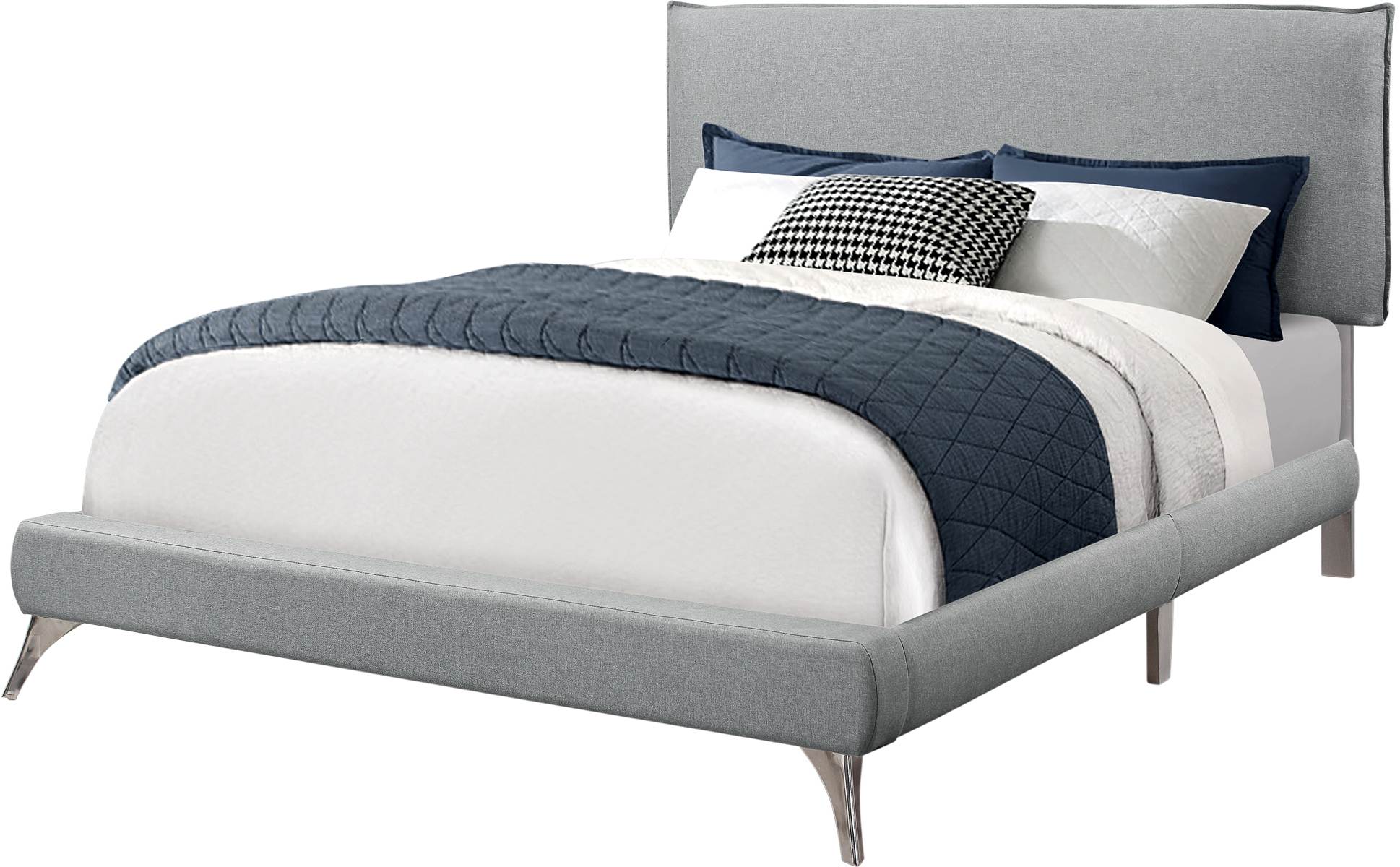 Renouvelez votre votre chambre à coucher avec ce magnifique grand lit rembourré de style contemporain. L'élégance de sa tête de lit rembourré de simili-lin gris et sa base soutenu par des pieds en métal chromé vous offrent un lit plate-forme qui s'adapte facilement à tous les décors. Ce cadre de lit requiert un sommier et un grand matelas. Un sommier à profil bas de 2 pouces est recommandé. Toutes les pièces avec instructions d'assemblage sont incluses.En savoir plus