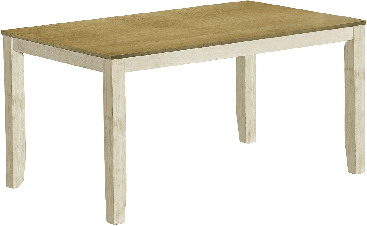 Trendy 60" rectangular dining table with a chic 2-tone antique white and antique light brown veneer finish in a transitional design, seats up to 6