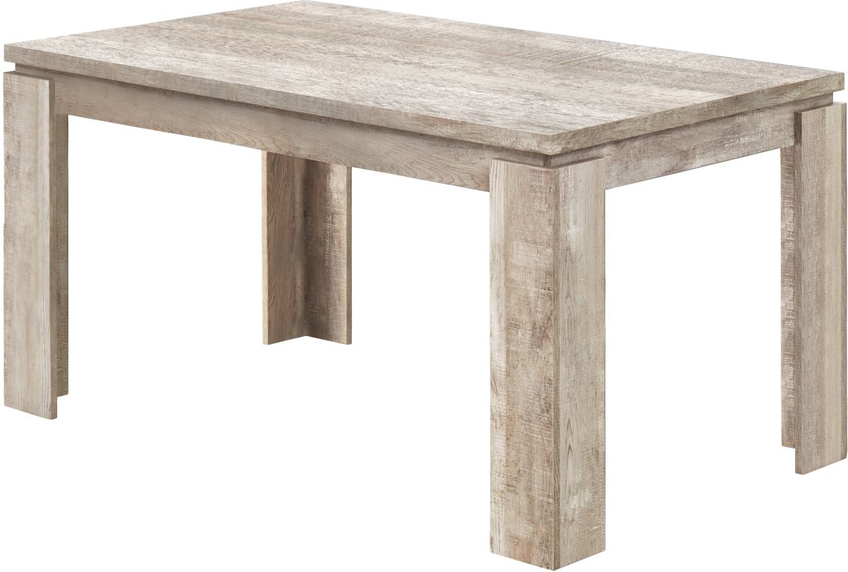 Looking for rustic? Looking for contemporary? How about both? This taupe thick-paneled kitchen table features a unique reclaimed wood look surface to offer the perfect unique style for your new place. The modern dining table also features thick, open block shaped legs to keep everything nice and sturdy. When it's time to make a statement in your home, count on this kitchen table to do the trick in a casual or formal dining setting. Chairs sold separately.
