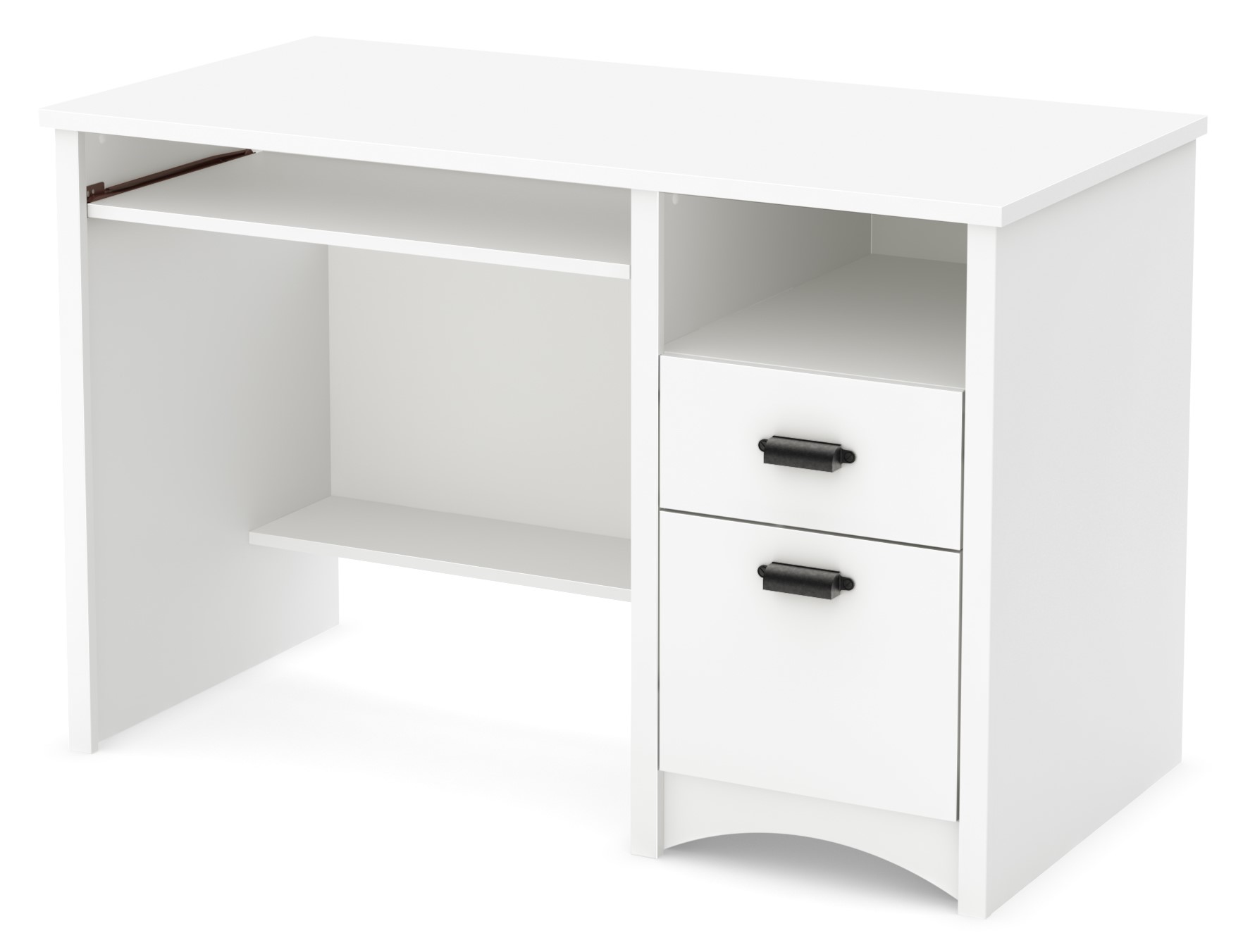 The desk features 1 utility drawer, 1 file storage drawer, and keyboard tray with metal drawer slides.