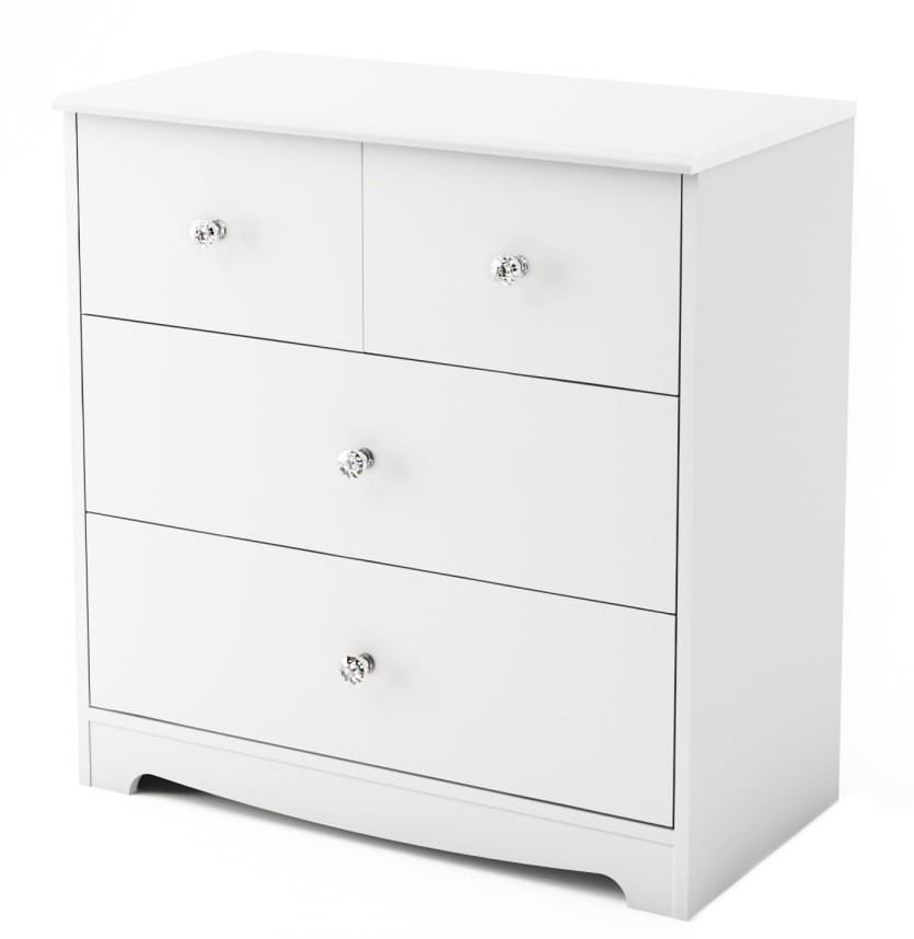 Featuring a simple curved kickboard and crystal-like knobs this dresser will add smiles to your little girl's room.