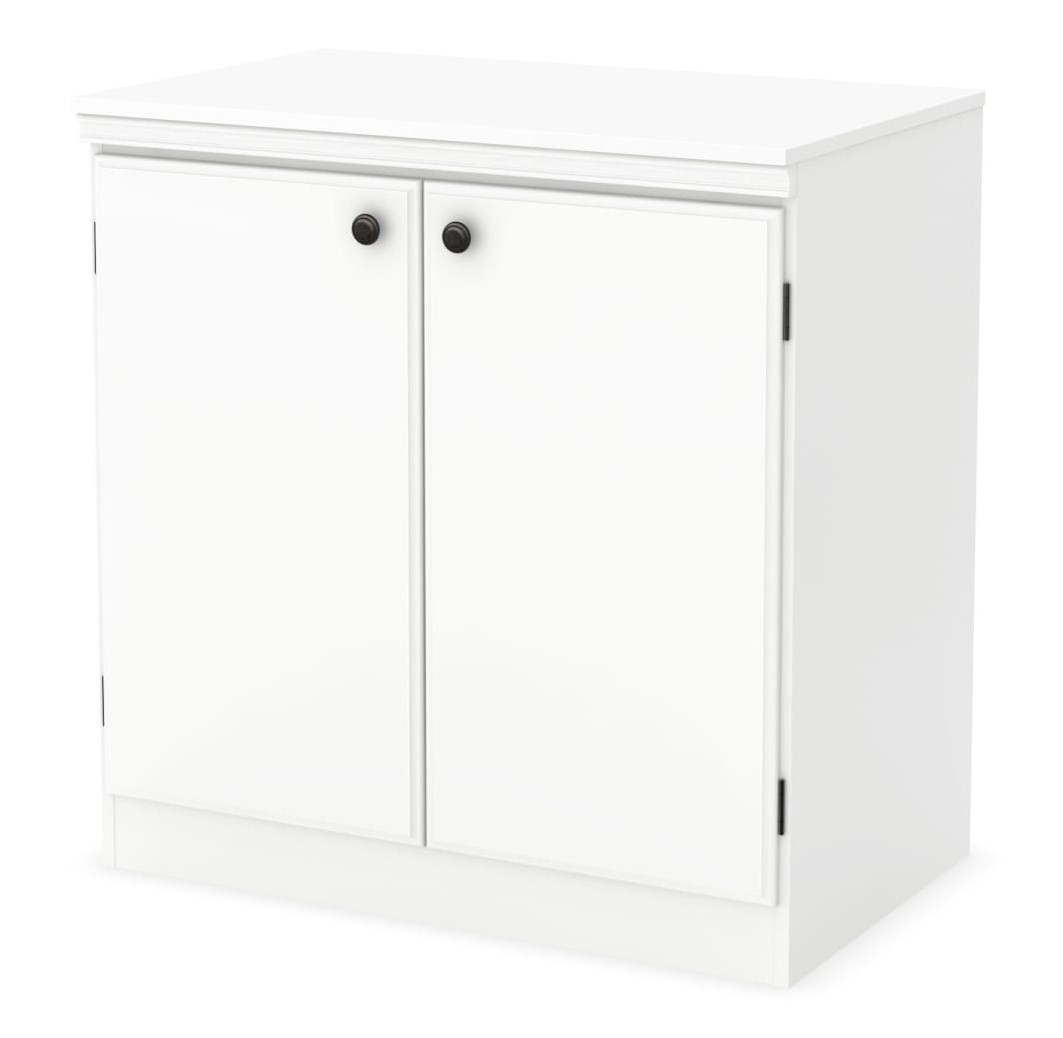 This 2-door cabinet features metal handles in a black finish and 2 storage spaces separated by 1 adjustable shelf.