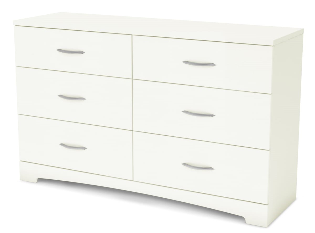 This Step One 6-drawer double dresser has a timeless look and blends in easily with any decor. The contemporary lines are softened by the curved kick plate, and metal handles add character and value to the furniture. The neutral, modern style makes it suitable for men’s and women’s, providing plenty of storage space in this attractive piece of furniture.En savoir plus