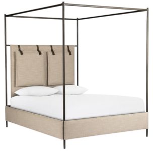 The Leigh Canopy Bed brings a refreshed safari-inspired design with a modern twist. Upholstered in high-performance fabric, it features leather straps that secure decorative suspended headboard pillows, adding an elegant touch. A box spring is required for this stylish and comfortable statement piece.Read More