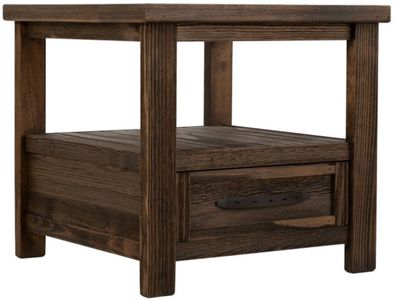 The Dutton End Table blends charm with practical storage. Crafted from lightly distressed wood in a rich brown multi-step lacquer finish, it features one drawer and an open shelf, offering ample space to keep your living area organized and stylish.Read More