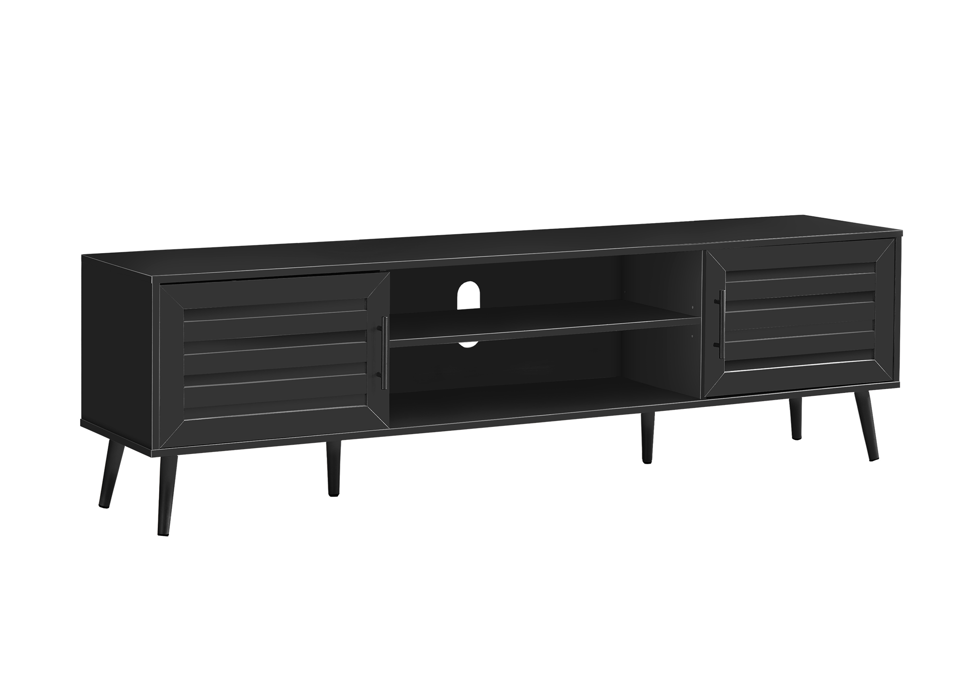 Ce meuble télé de style transitionnel de 72 pouces, avec une finition en stratifié noir, s'harmonisera avec tous les styles de décoration, tandis que ses pieds inclinés en bois massif noir ajoutent une touche discrète inspirée du milieu du siècle dernier