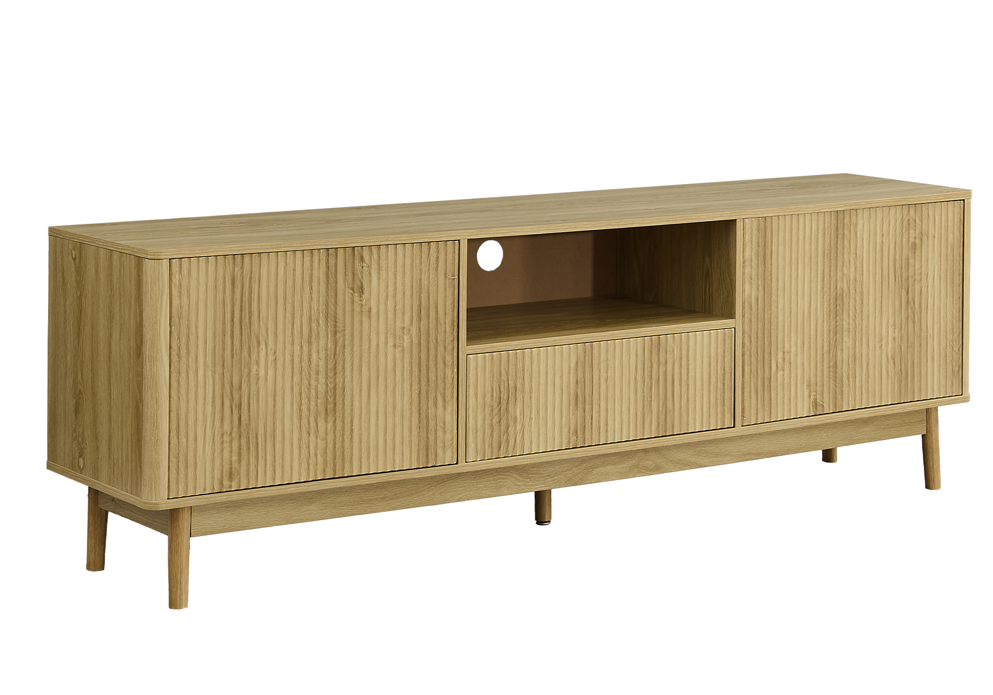 Offrant une combinaison de 2 armoires de rangement fermées et d'un tiroir de rangement pratique, tous deux avec un design à façade nervurée, ainsi qu'une étagère ouverte pour un mélange parfait de fonctionnalité et d'élégance pour votre meuble multimédia